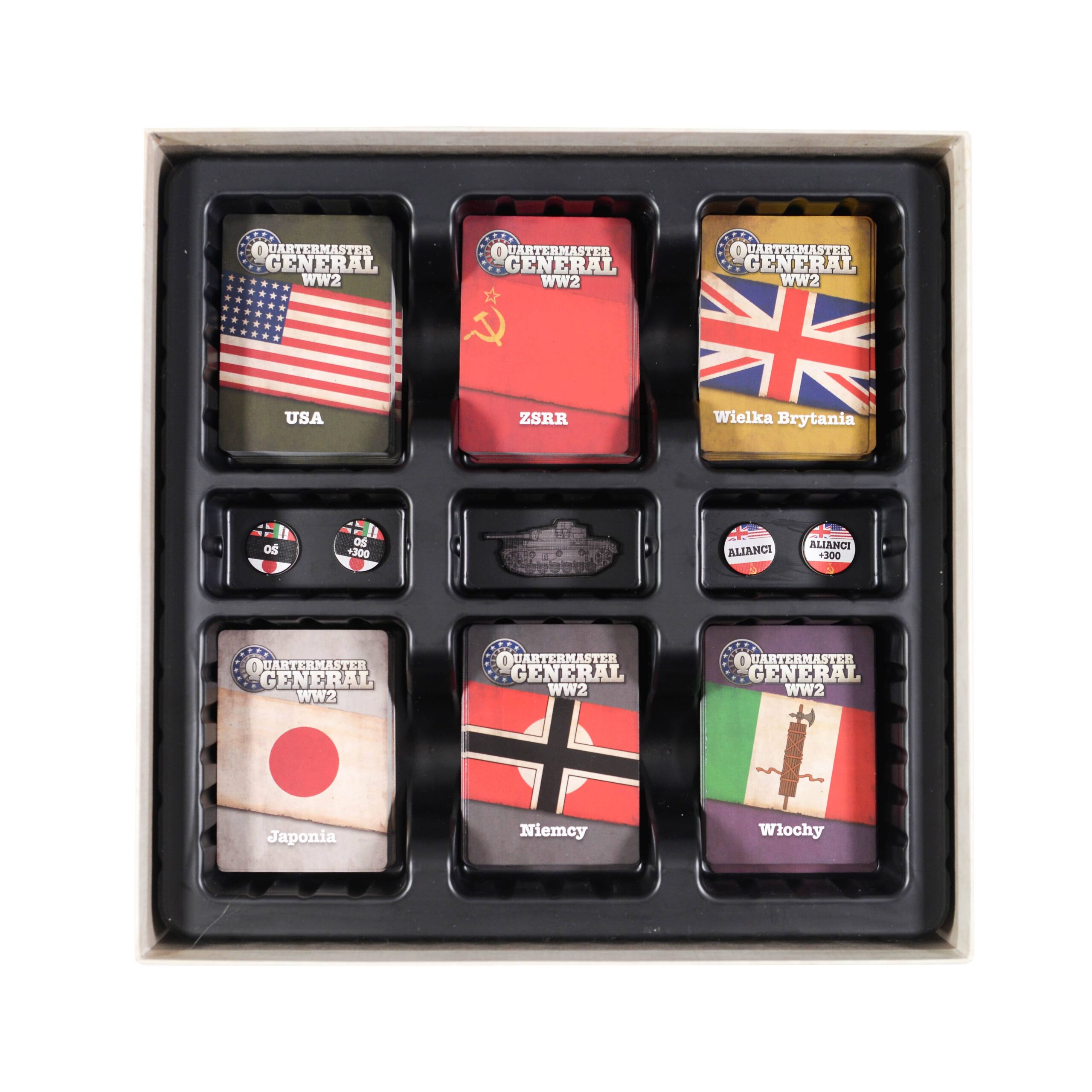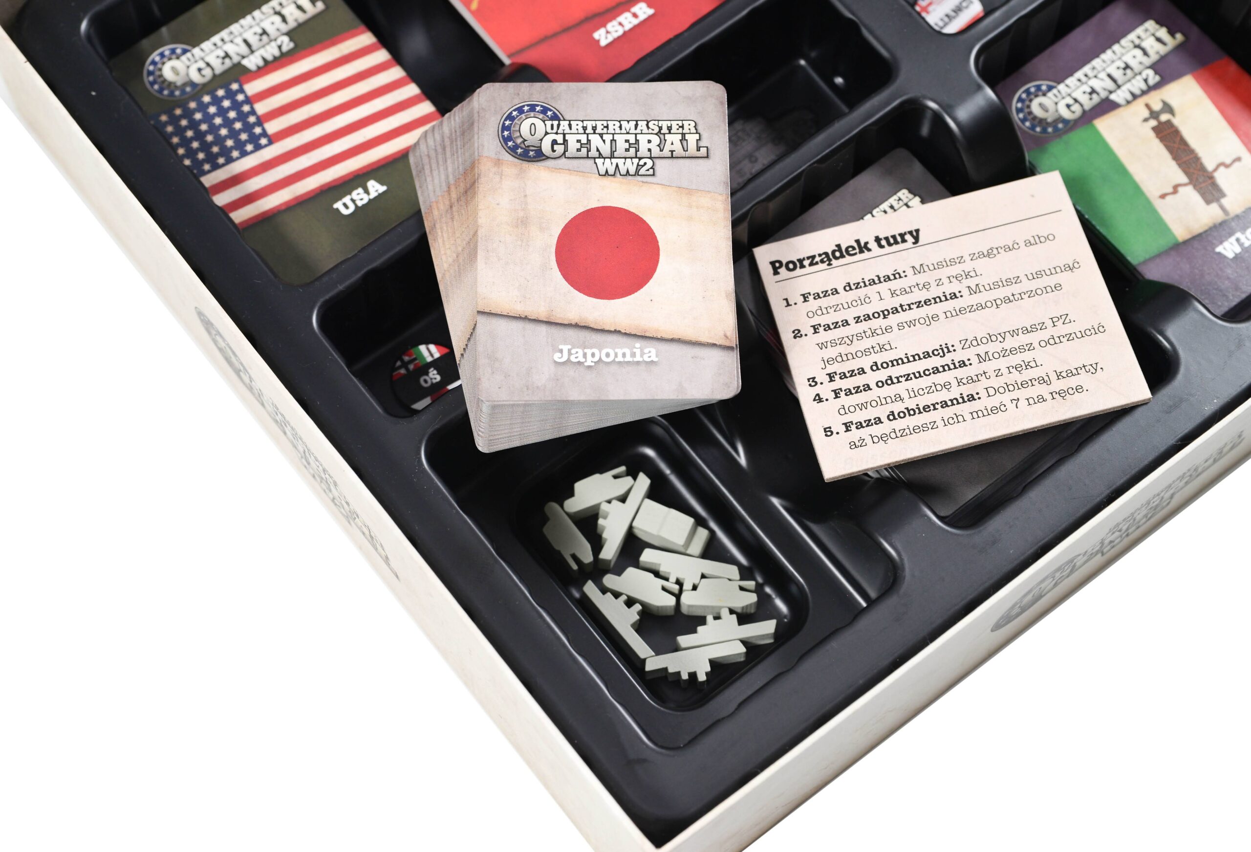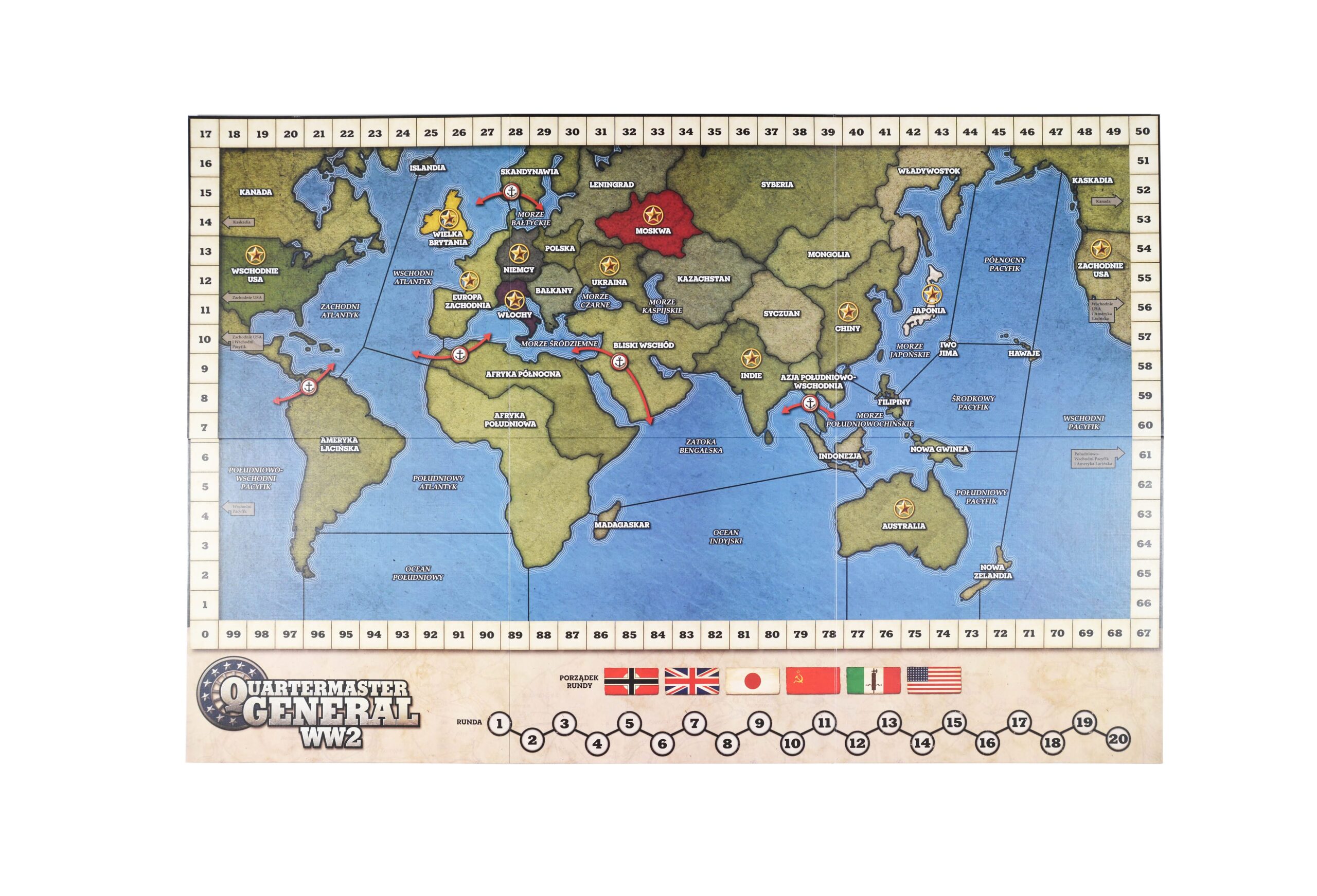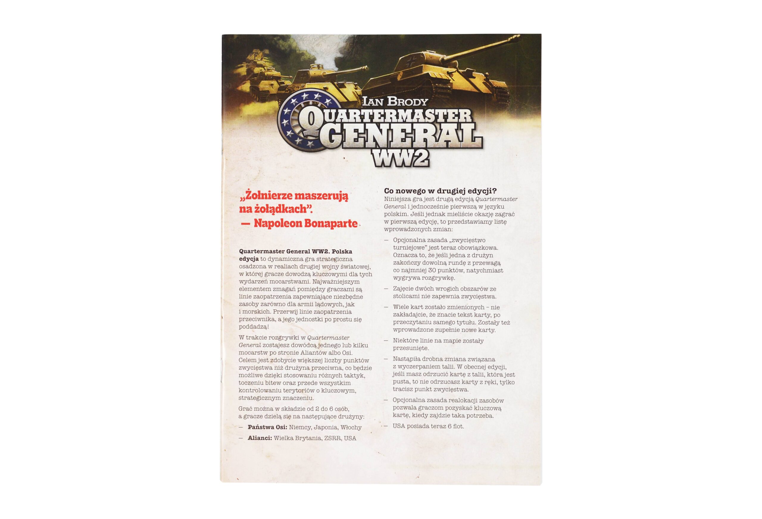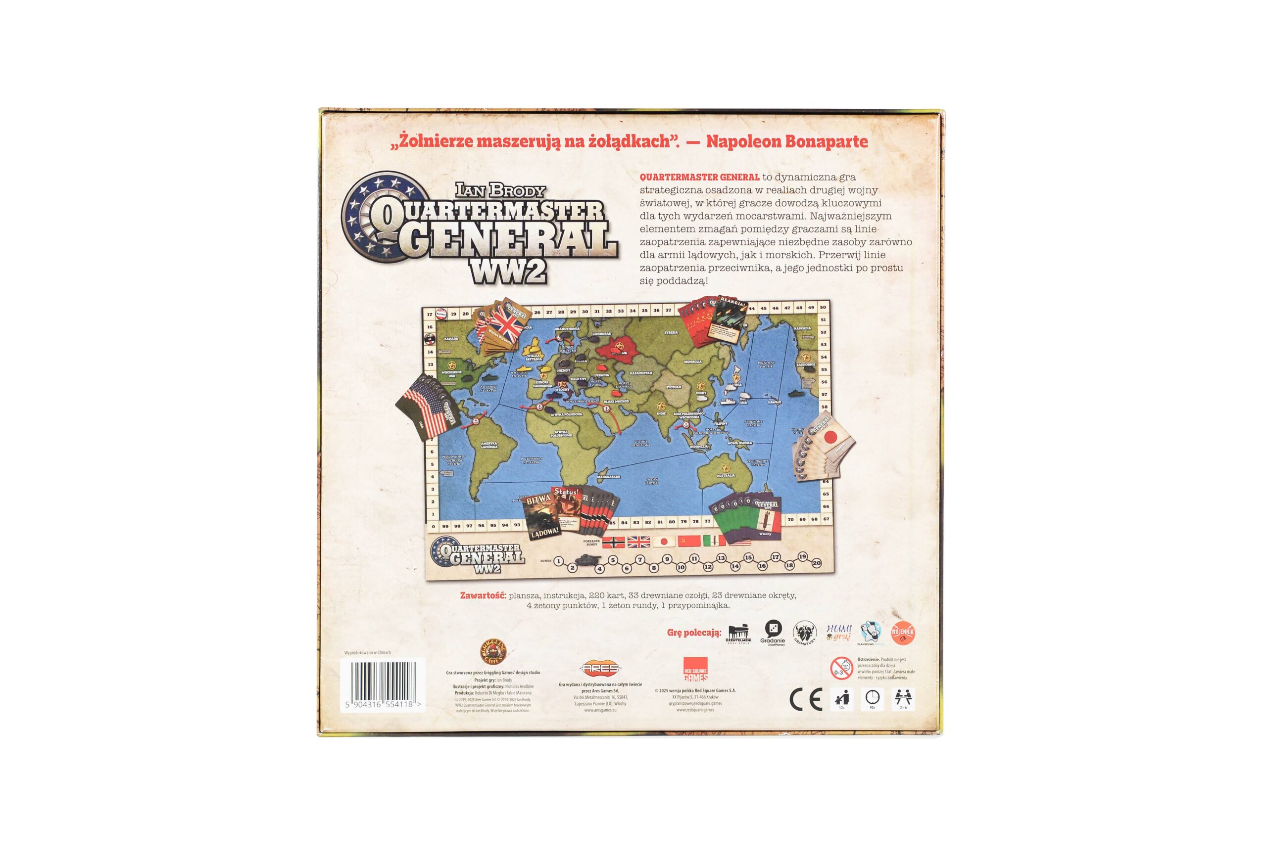 Quartermaster General: WW2 – Druga edycja to dynamiczna gra strategiczna osadzona w realiach drugiej wojny światowej, w której gracze dowodzą kluczowymi dla tych wydarzeń mocarstwami. Najważniejszym elementem zmagań pomiędzy graczami są linie zaopatrzenia zapewniające niezbędne zasoby zarówno dla armii lądowych, jak i morskich. Przerwij linie zaopatrzenia przeciwnika, a jego jednostki po prostu się poddadzą!