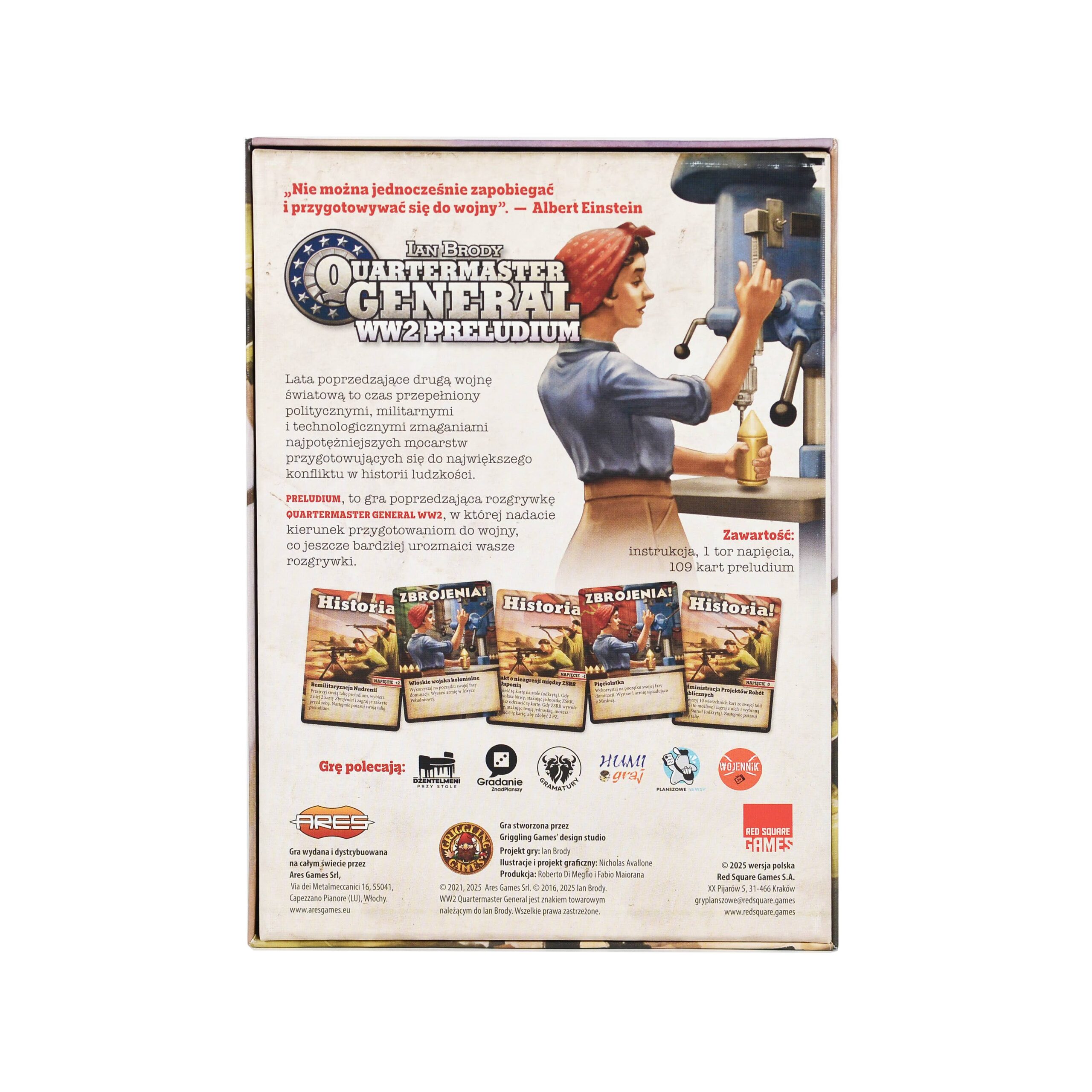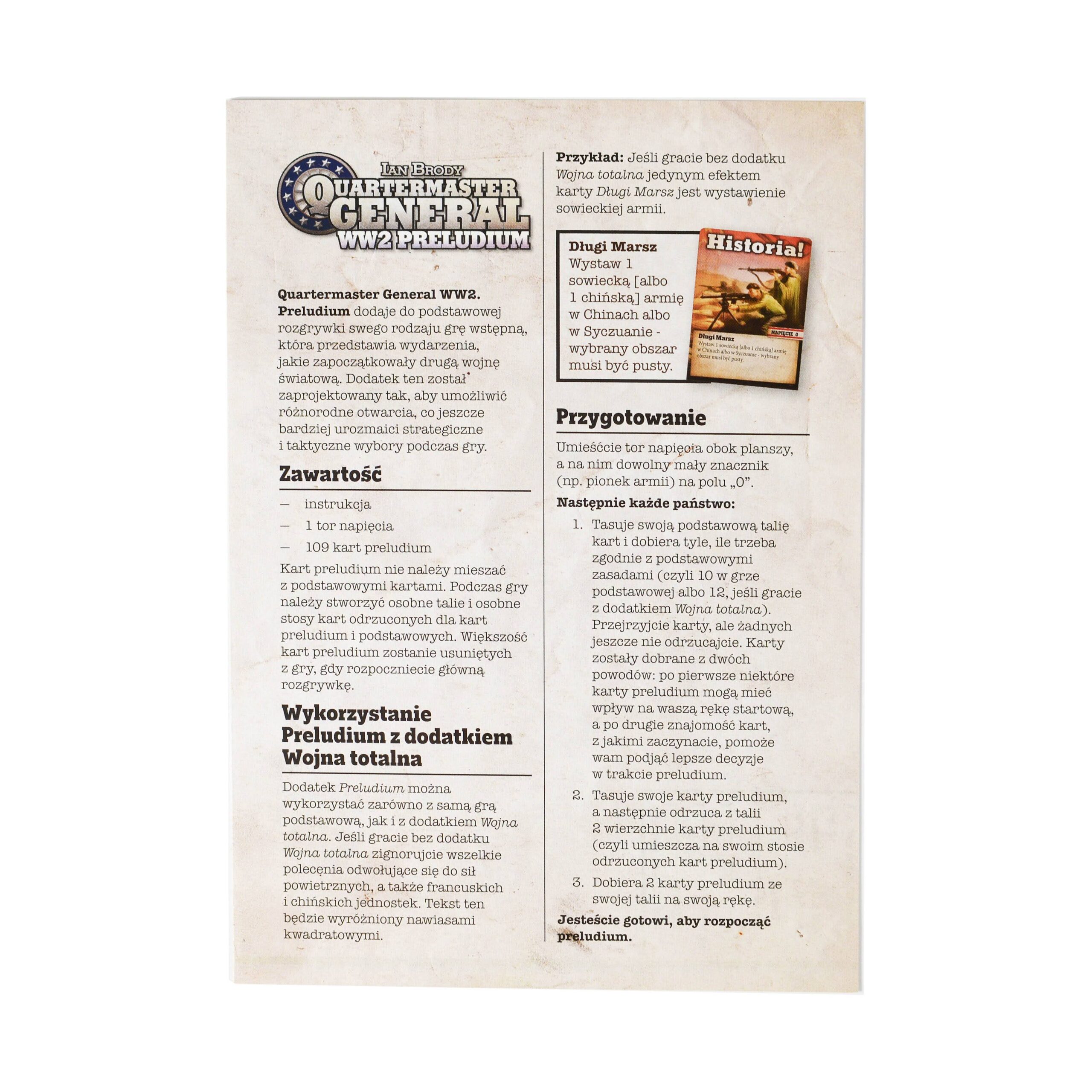 Preludium to dodatek do gry Quartermaster General: WW2, który rozszerza rozgrywkę o wydarzenia i decyzje z okresu poprzedzającego wybuch II wojny światowej. Wprowadza nowe karty i mechaniki, pozwalające graczom wpływać na układ sił jeszcze zanim konflikt ogarnie świat.
