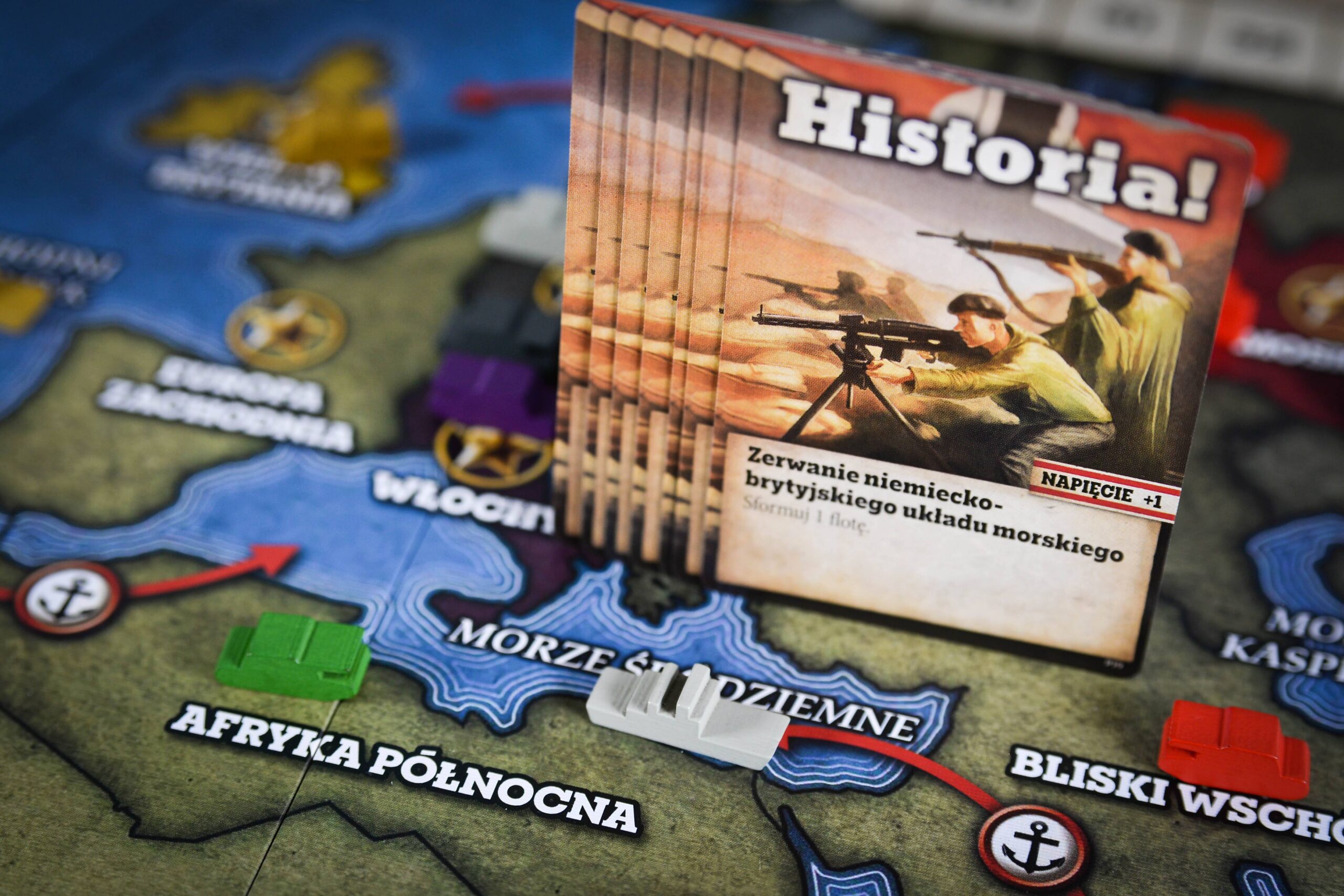– Karty Historii! są zazwyczaj rozpatrywane natychmiast po zagraniu i zwiększają lub zmniejszają poziom Napięcia. Karty Zbrojeń! zagrywane są zakryte, podobnie jak karty reakcji, lecz ich użycie (w trakcie rozgrywki głównej) wymaga odrzucenia standardowej karty z ręki.